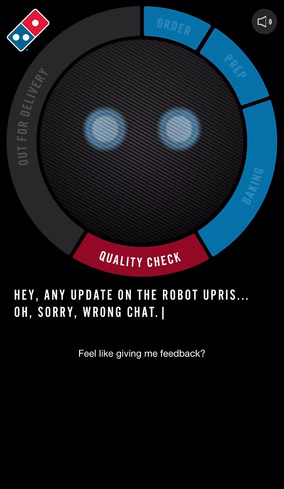 While on our first ever placement at VCCP, we wrote some jokes for the Dominos robot pizza tracker.
